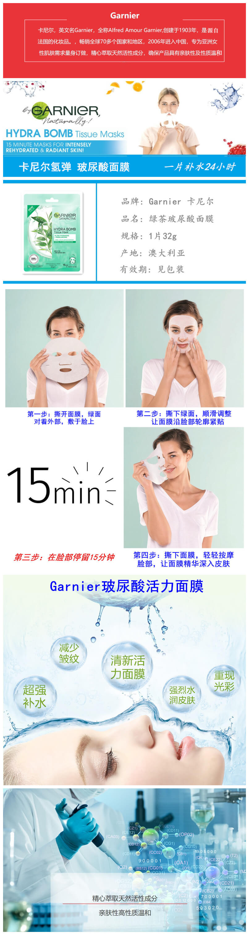 当前位置: 首页 > 美妆洗护 > Garnier 卡尼尔氢弹 玻尿酸绿茶面膜 4片装